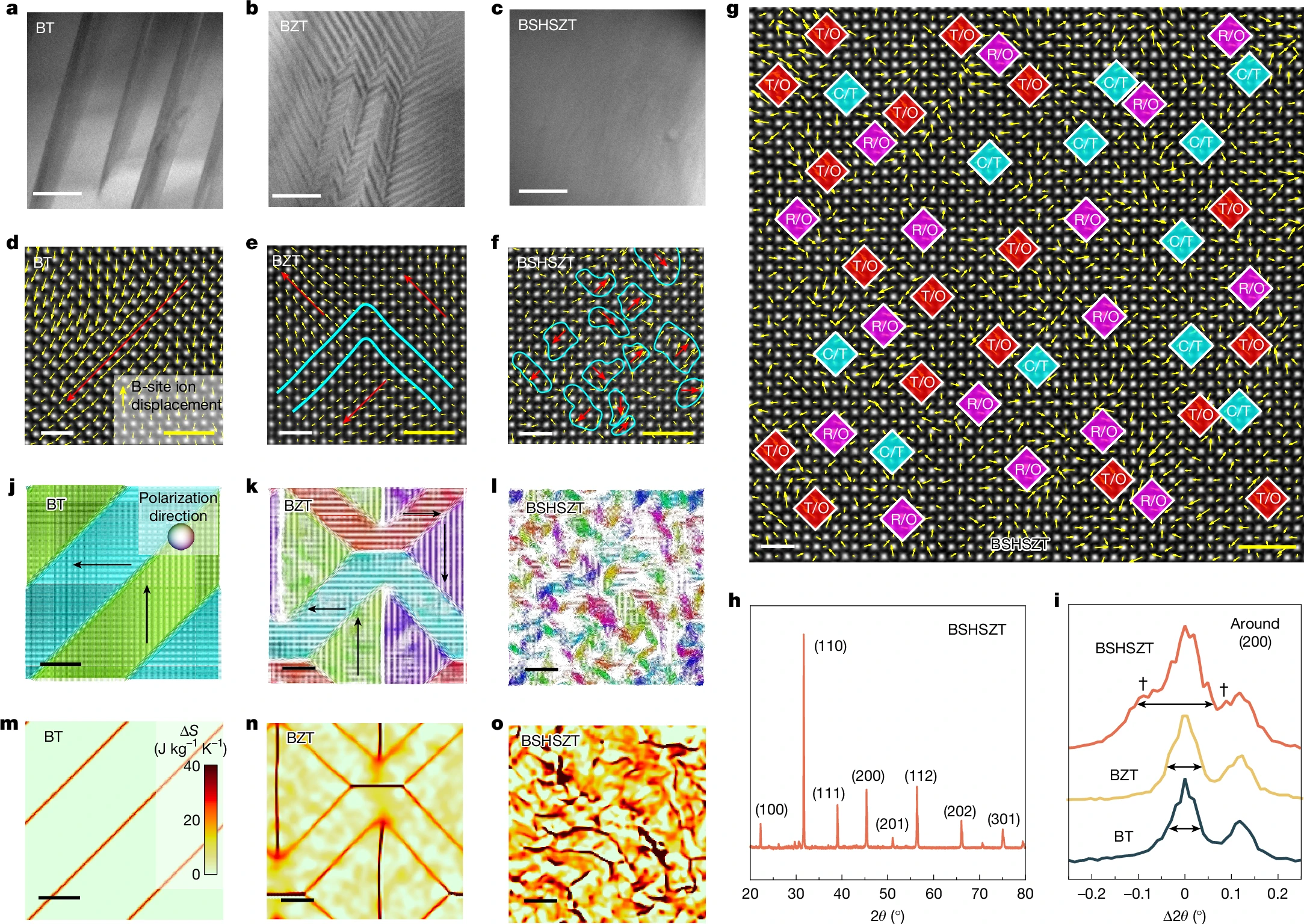 通过透射电子显微镜和X射线衍射等结构表征,研究人员揭示了BSHSZT的确比BT和BZT具有更混乱无序的极性结构。随着A或B位元素取代给钙钛矿晶体结构带来的扰动加剧,BT中大块的铁电畴首先会破碎分裂成BZT中更小的交错的畴域,并进一步在极化高熵BSHSZT陶瓷中退化成仅由数个晶格组成的极性团簇。这些极性团簇尺寸远小于传统意义上的极性纳米微区,且彼此极化方向不同。相场模拟揭示了极性团簇间的界面具有较强电场响应活性,因此在电场下贡献了巨大的极化熵变,成为了BSHSZT陶瓷中大电卡效应的来源(图2)。