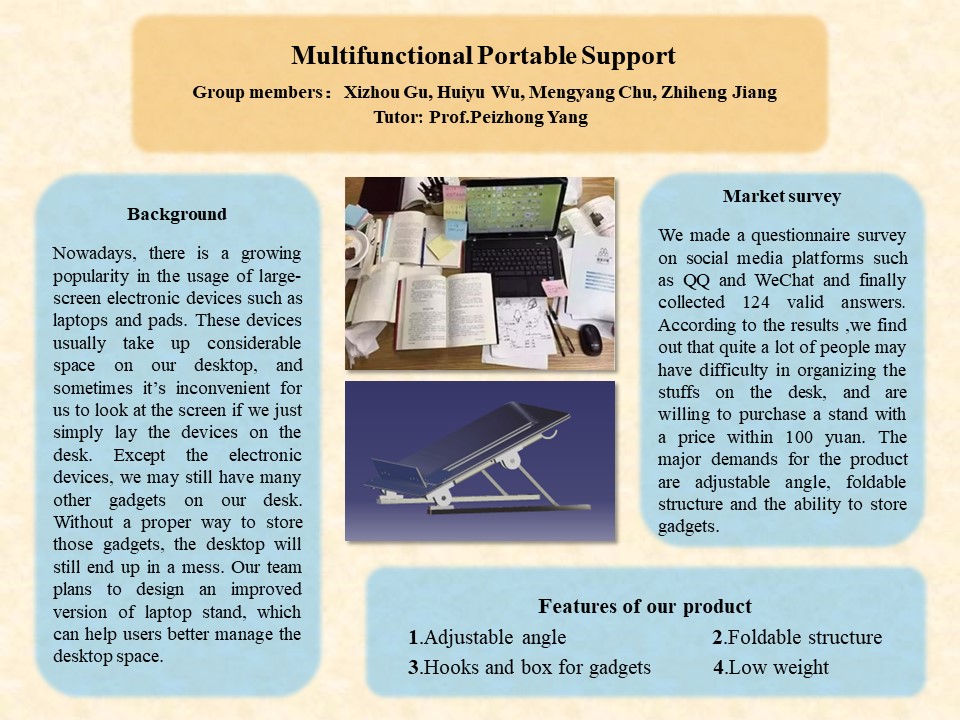 We hope to develop a multi-functional support that can simultaneously have the functions of reading book support, laptop support, earphone storage, stationery storage and other functions. It adopts the portable design to realize the high integration of various functions at the same time and takes the mechanical structure as the main innovation point. Make the final product guarantee the functionality of both firmness, beauty and relatively high cost performance, in order to occupy a certain market share.