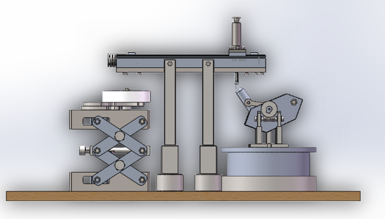 其中最左侧为药液供给模块可以通过旋转螺杆带动药液台上升与下降,保证后续药瓶与吸液器的竖直方向配合,上方间歇转盘(槽轮机构)可实现四种药液的切换从而能在后续满足将不同药液混匀的工艺需求;中间为药液转移模块可以通过滚珠丝杠机构带动工作台进行精准的横向移动,用于吸液器与药瓶或混液瓶配合,而改装的注射器可以借助螺旋传动原理带动活塞抽拉完成定量吸放液操作;最右侧为振荡摇匀机构,底部的圆筒是个大转盘可以实现整个机构的旋转,上方还设有曲柄摇杆机构可以实现混液瓶另一自由度的运动摇匀,从而充分摇匀,此外利用蜗轮蜗杆还可进行连杆机构位姿的调整以便倾倒液体。