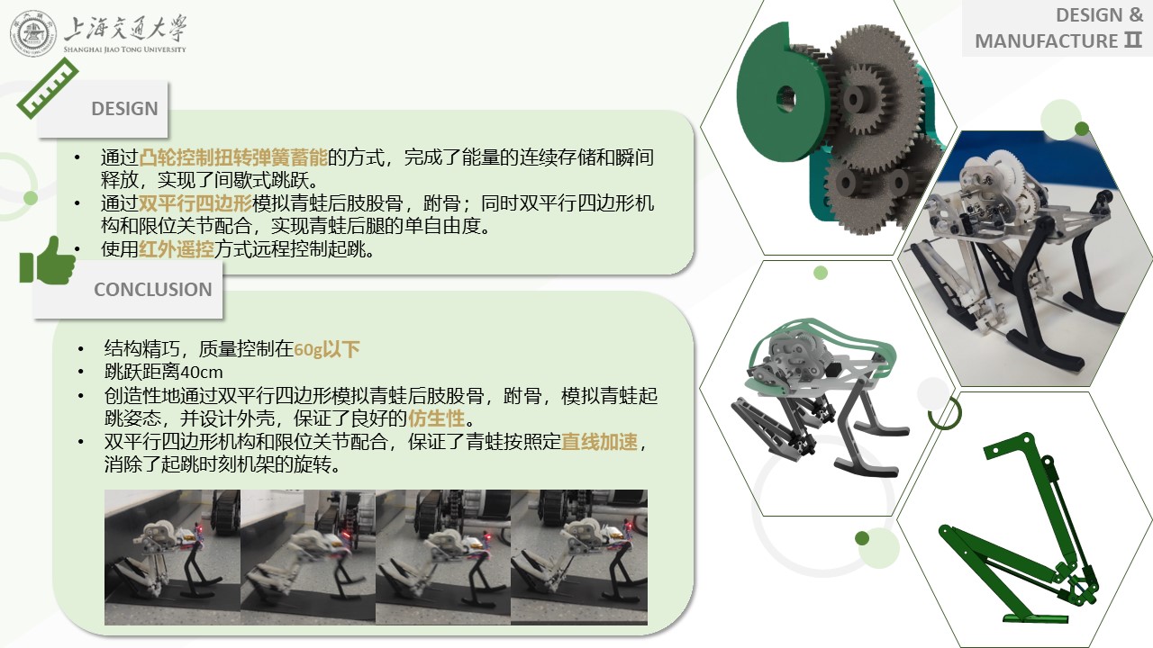 基于设计与制造Ⅱ课程项目所设置的项目挑战赛——仿生青蛙跳跃机器人,本项目以青蛙作为仿生研究对象,旨在研究青蛙的骨骼结构和跳跃机理。结合相关调研,我们设计了一款仿生青蛙跳跃机器人,该机器人根据青蛙骨骼结构,创造性地设计双平行四边形结构模拟青蛙后肢,以扭转弹簧为储能原件,配备减速齿轮组和设计特殊的凸轮形状,并通过红外遥控方式远程控制,以实现能量的连续储存和瞬间释放,达成机器人能够实现远距离、间歇式跳跃的目标。