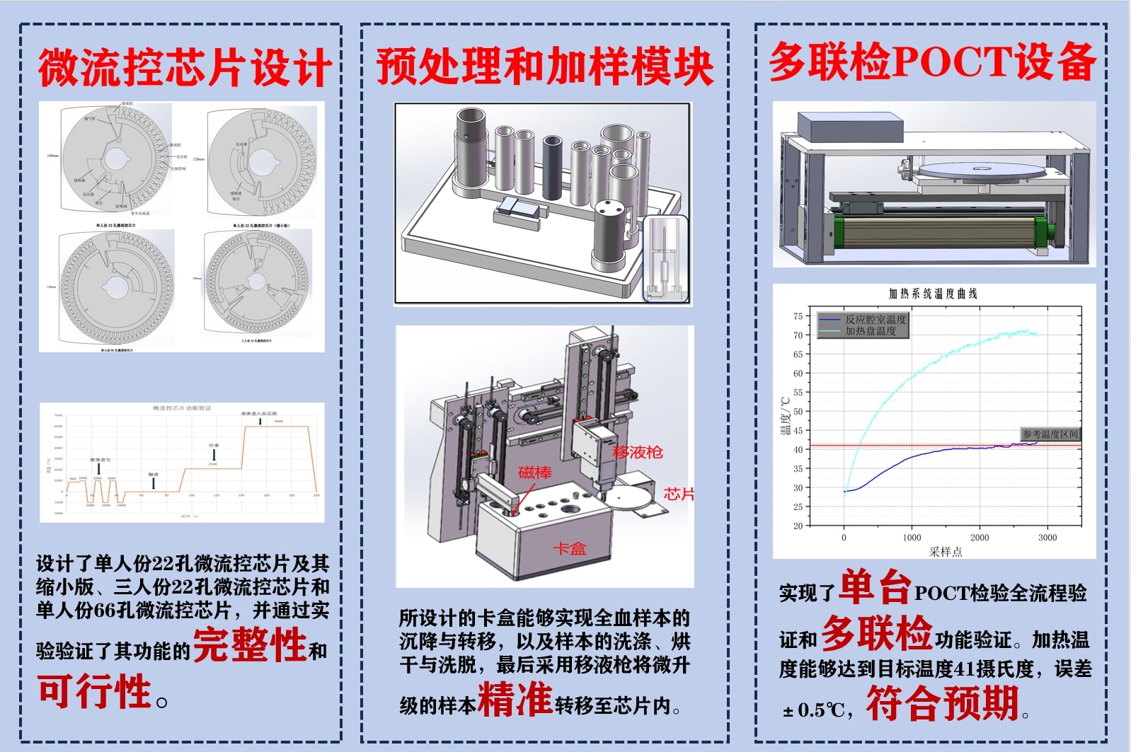 开发多联检POCT分子诊断设备及其配套微流控芯片1、微流控芯片设计与微液滴驱动方法研究;参考现有单人份微流控芯片,设计可容纳4人份样本并检测20种病原体的微流控芯片,研究微液滴驱动方法,确定稳定可靠的驱动方式,仿真外力作用下微液滴在微流控芯片中的流动;针对单人份样本,设计满足超多重(≥150种病原体)检测要求的微流控芯片,优化微反应孔、微流控阀门、核酸提取腔室等结构及其在芯片上的分布,将芯片外径控制在160mm以内。2、芯片自动加样与封装系统开发;根据现有的微流控芯片结构以及测试前需要加入的检测试剂,开发微流控芯片自动加样装置,实现样本、磁珠、液态石蜡、缓释液等液态试剂的一次性自动加装;开发薄膜贴附封装机构,实现微流控芯片各腔室、流道的封装。3、多联检POCT设备软硬件系统开发;根据现有POCT设备内部架构,设计多联检POCT设备硬件系统架构,合理分布设备中的磁铁、导轨、电机、温控模块、荧光检测模块、控制板卡以及触摸屏等元器件和机构;在现有的POCT设备控制软件基础上开发多联检POCT设备软件系统,独立控制各微流控芯片的入仓和出仓,实现随到随检;在线监控设备卡槽内是否有微流控芯片,实时显示检测进程。