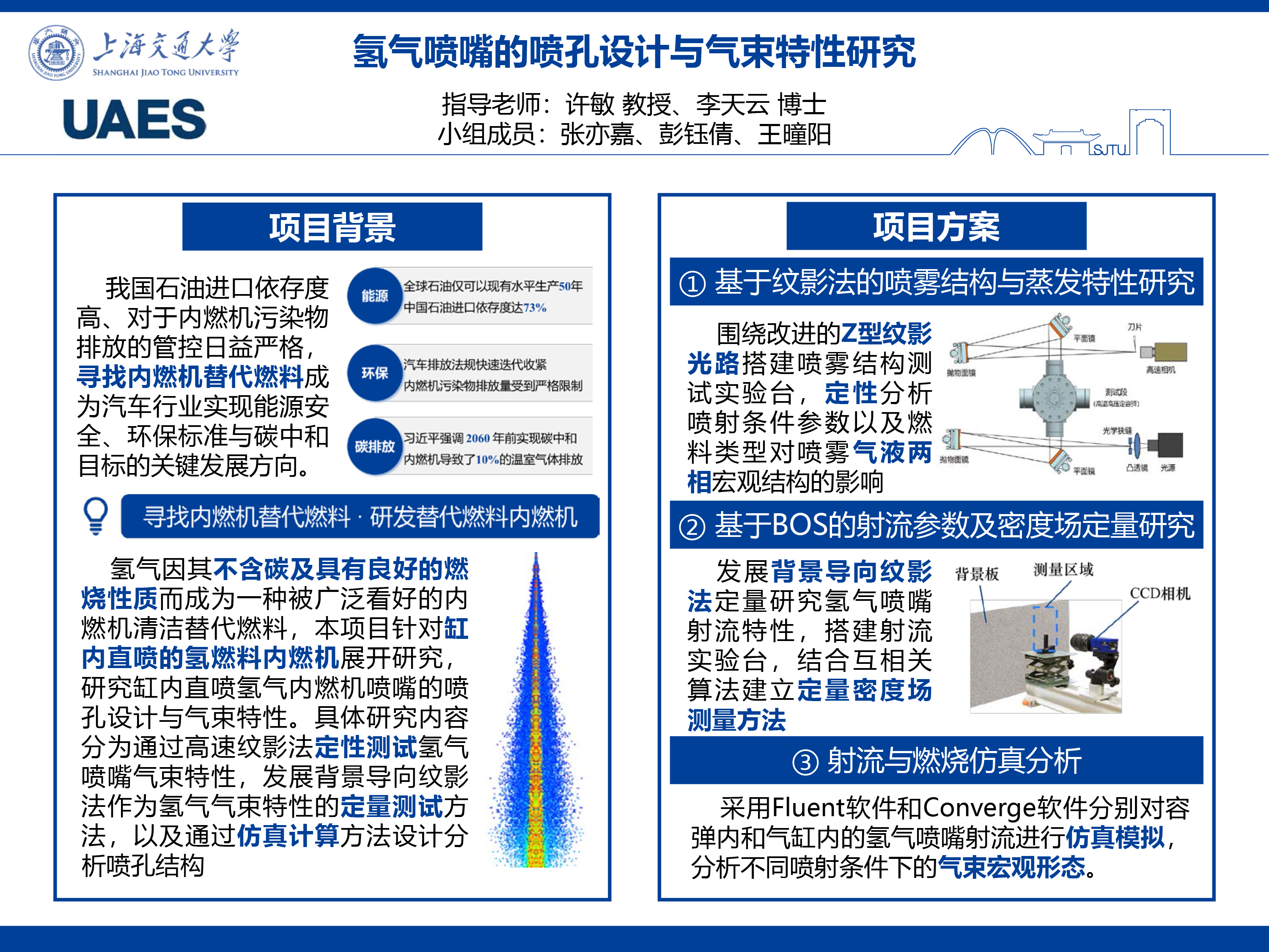 本项目希望结合高速纹影法与背景导向纹影法研究氢气直喷喷嘴的气束特性,基于测量得到的射流气束特性标定仿真模型,分析喷嘴结构对氢气射流气束特性的影响。受到疫情封校影响,本研究原定实验计划无法按期执行,故对项目内容进行调整,将采用高速纹影法研究燃料喷雾的宏观结构与蒸发特性,基于初步的氢气喷嘴实验数据优化背景导向纹影法用于记录气体密度场测试效果,并采用Fluent软件和Converge软件分别对容弹内和气缸内的氢气喷嘴射流进行仿真模拟,对4种喷嘴进行喷射仿真分析,研究不同仿真因素和不同喷孔设计的气体喷射流量和气束特性。