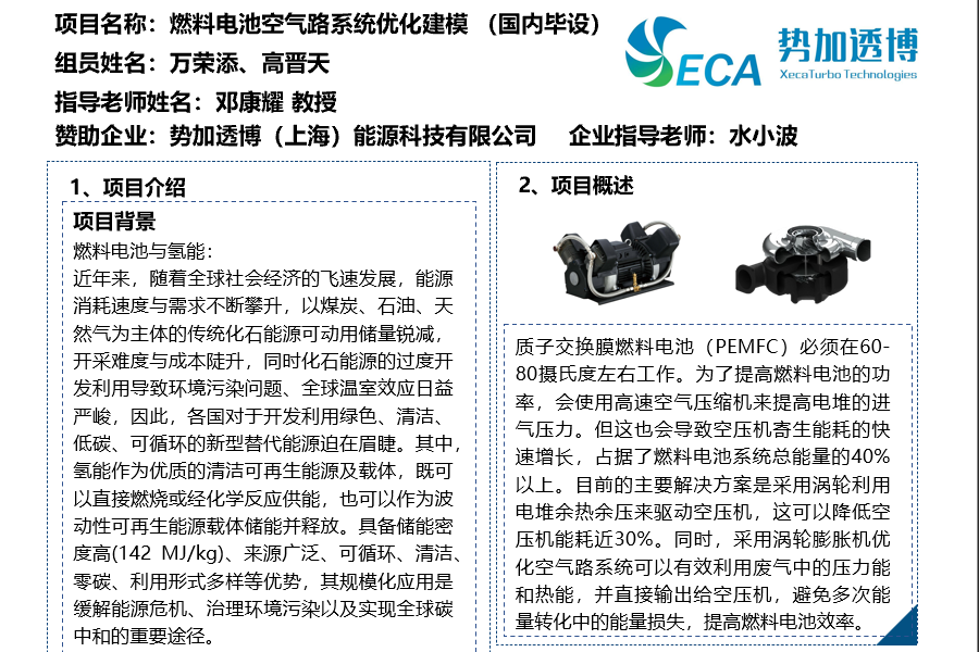 质子交换膜燃料电池(PEMFC)必须在60-80摄氏度左右工作。为了提高燃料电池的功率,会使用高速空气压缩机来提高电堆的进气压力。但这也会导致空压机寄生能耗的快速增长,占据了燃料电池系统总能量的40%以上。目前的主要解决方案是采用涡轮利用电堆余热余压来驱动空压机,这可以降低空压机能耗近30%。同时,采用涡轮膨胀机优化空气路系统可以有效利用废气中的压力能和热能,并直接输出给空压机,避免多次能量转化中的能量损失,提高燃料电池效率。