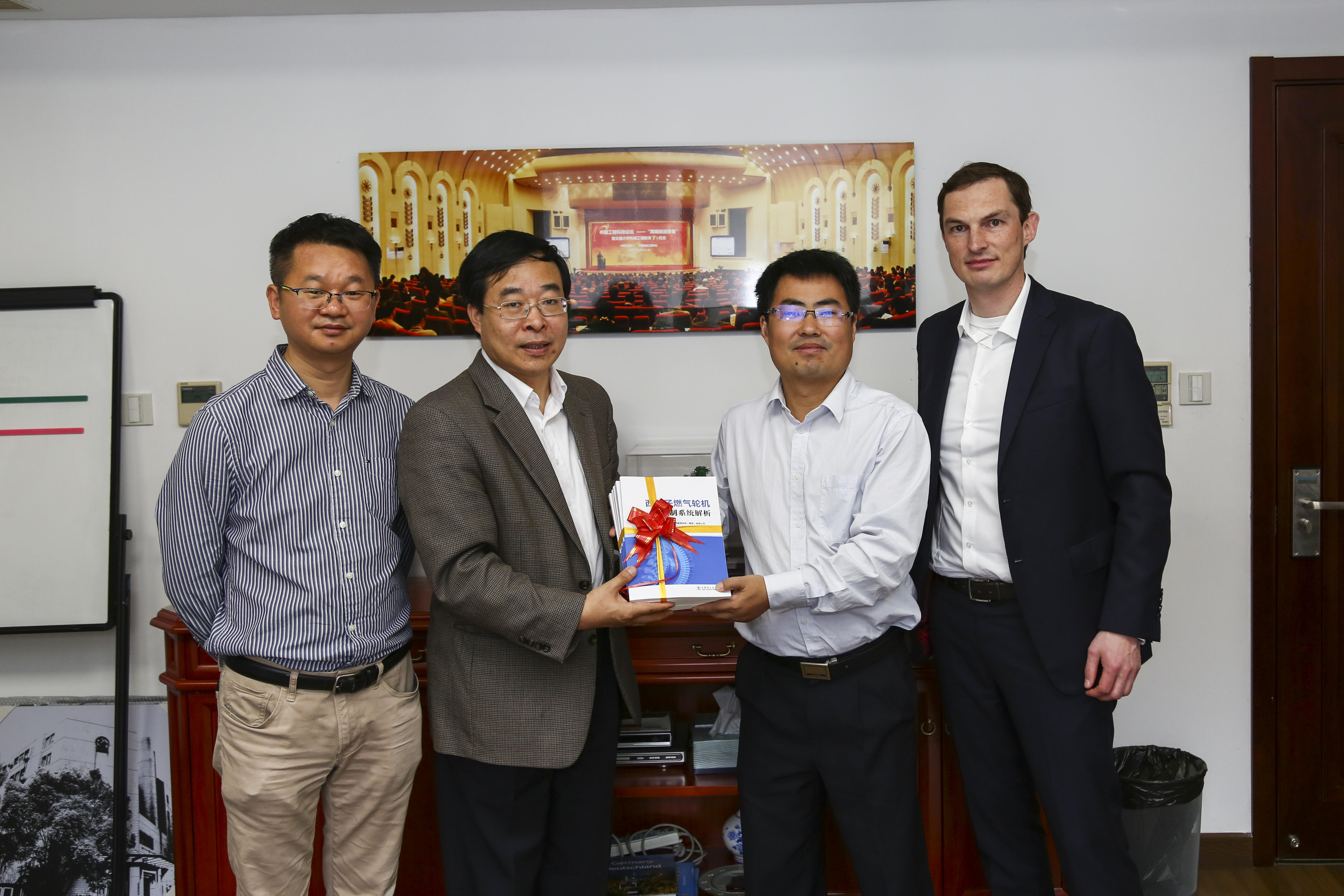 学院教师彭迪、夏唐斌作为联合培养博士生导师与周业涛、Neuenhahn共同在合作协议上签字。周业涛代表西门子公司向学院捐赠近百本燃机领域的书籍。
