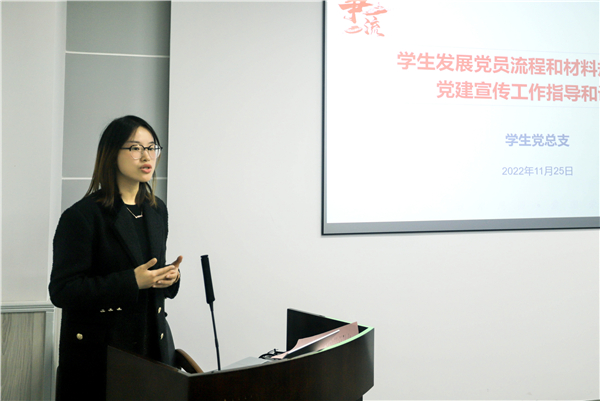 卢丹阳对发展党员流程、操作规范以及党建宣传工作的格式规范、常见问题等进行了详细介绍。辅导员王玉婷介绍了党员发展信息化工作平台,希望各支部利用信息化平台推动支部工作信息化、规范化建设。辅导员刘杰学针对学生党员及党支部年度考核及民主评议工作要求进行了讲解。