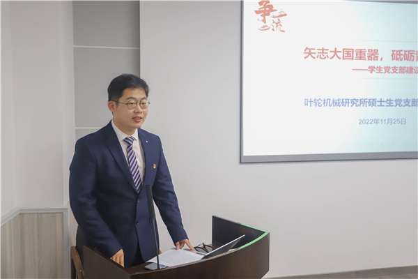 在支部工作交流环节,叶轮机械所硕士生党支部书记史挺以“志向”、“青春”、“砥砺”和“聚焦”四个关键词,提出开展学生党支部工作要有规划力和行动力,要勇于尝试,介绍了支部瞄准“两机”重大战略,“矢志大国重器,砥砺青春之志”,联合教工党支部将党建与科研深度融合,积极推动与两机重点单位共建,实现党建与科研同频共振双提升的做法和经验。新能源动力所硕士生党支部书记房明明以“能源澎湃,动力无限,共行共建”为主题,交流了支部与清华大学研究生党支部共建、与七一一研究所开展行业共行的思路与开展情况,分享支部建设中遇到的难点、解决思路等,与各位支部书记共勉。