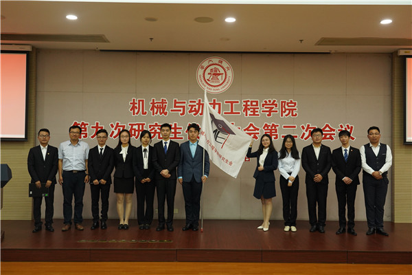 新老主席团进行交接仪式,顾希垚为新一届主席团授旗。他对上一届研会的工作表达了肯定,向新一届主席团表示学生工作的本质就是奉献青春,服务同学,希望大家再接再厉,砥砺前行。