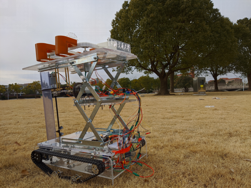 项目将种树和机械结合,采用履带移动方式,并通过平台上功能模块的安装、整合,实现开洞、送苗、培土等植树过程一体化的种树功能,减少人力资源消耗,扩大绿色覆盖面积。产品应用广泛,可用于常规植树、沙地植树等多种场景。作品主要分四大模块:移动平台采用履带移动,同时设计了双齿轮啮合模式,有效防止了旋转的脱齿运动;开洞模块采用钻的模式,通过改变钻头可以选择不同大小的树苗播种;送苗模块采用链轮传动带动送苗杯,由凸轮机构实现推苗动作,并设计了镂空式放苗杯,解决了苗落下位置的准确性;控制模块采用 ESP8266 物联网芯片,通过手机端 wifi远程控制机器。