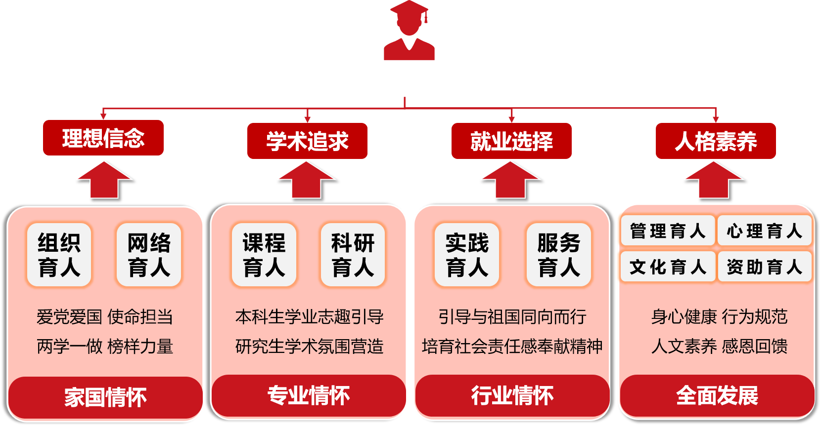 学院2018年入选“三全育人”试点院系,通过构建“大德育、大思政”的全员育人工作平台、建立“面向全体、分类引导、重点培养”的全过程育人长效机制、打造“多维度、多元化、多平台”的全方位育人品牌模式,进一步凸显价值引领,培育具有家国情怀和行业理想的大制造领域一流拔尖创新人才。