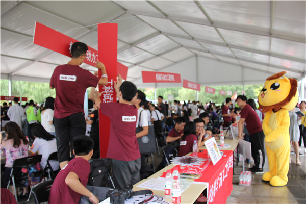 迎新摊位旁挤满了家长和新生,各种别具学院特色的标语牌、纹身贴赚足眼球。广受喜爱的还有beat365 手机版官方网站的吉祥物“ME锤锤”。后者可爱的形象吸引了许多同学和家长前来摊位前合影。想必在这一天拍下的每一张照片,都是新同学们弥足珍贵的青春足迹。