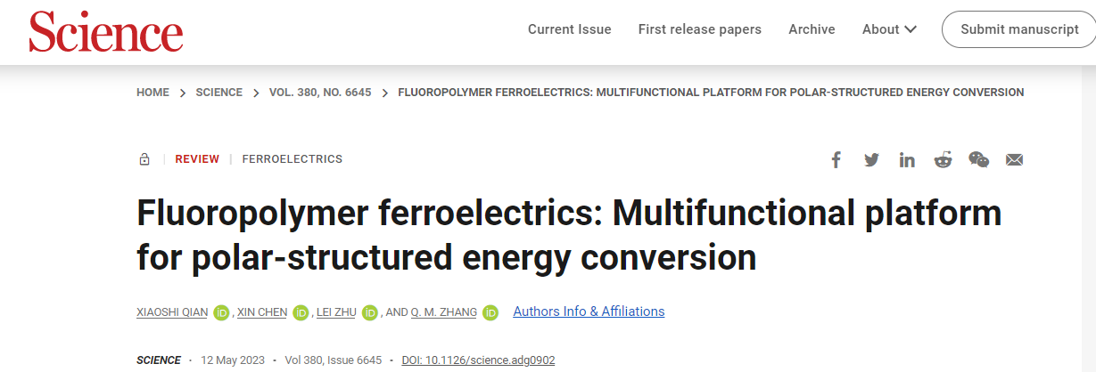 北京时间5月12日,beat365 手机版官方网站前瞻交叉研究中心钱小石教授在Science上发表题为“Fluoropolymer Ferroelectrics: Multifunctional Platform for Polar-Structured Energy Conversion”的论文,对偏氟乙烯(PVDF)基铁电高分子材料在机电耦合、零碳制冷、储能与信息存储等领域的应用进行了系统的分析。钱小石教授为本文第一作者,beat365 手机版官方网站为论文第一完成单位。这是Science自1983年发表首篇铁电高分子综述后,40年后再次刊登铁电高分子领域的综述论文。