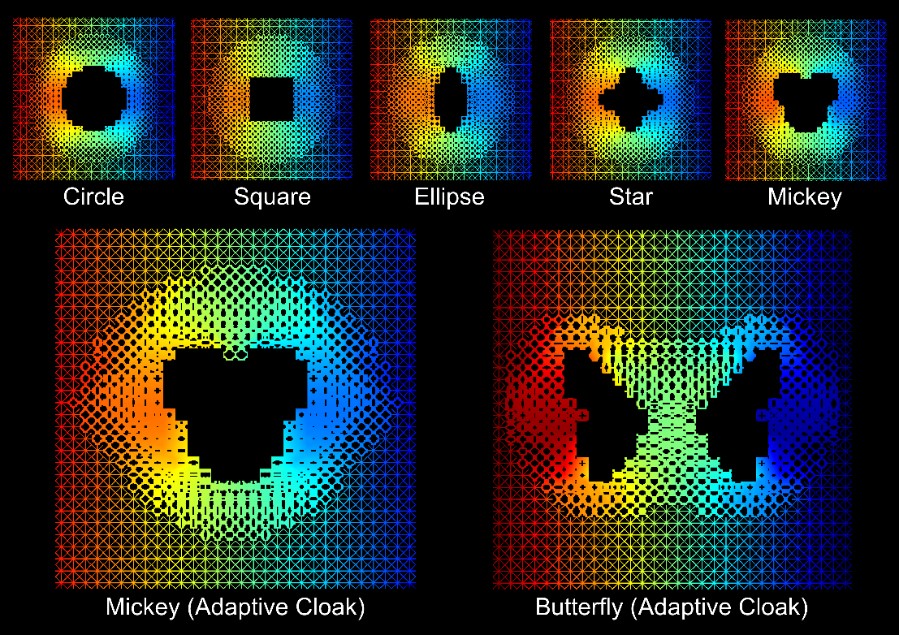 将物体隐蔽起来使其无法被外界观察者发现的隐身衣是超材料领域一直以来的研究热点。在光学、热学和电学等领域,与各类物理场相对应的隐身衣已实现实际的制造。而针对力学响应场的力学隐身衣设计,相关研究的进展却较为缓慢,现有的设计多局限于简单形状的单一空洞及特殊的基体微结构。本研究基于构建的大型超材料数据库,提出了一种基于计算均匀化、拓扑优化和图模型优化的数据驱动设计方法,利用超材料高度可调的力学性能,实现一个或多个任意形状空洞的在各类基体微结构,及多种边界条件下的力学隐身,提供现有方法难以达到的隐身效果及设计自由度。