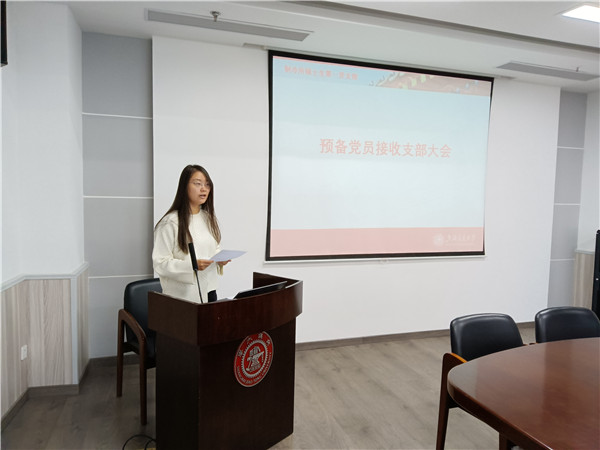 会议第二部分由苏元迟主持,进行了刘雨声的预备党员接收支部大会。首先奏唱国歌,在国歌声落下后,刘雨声简单介绍了自己本科及研究生以来的学术成果、参与的学生工作及所获荣誉奖励等个人信息。随后,支部副书记陈楚夫代考察人、组织委员施轶炜代支委会发表了考察意见。二位均表示,刘雨声同志为人和善,与同学相处融洽,在科研工作中认真努力,也取得了多项学术成果,但要注意平日规律作息,加强身体锻炼。根据支部党员同志投票表决,支部同意接收刘雨声为预备党员。面对支部的接收,刘雨声发言表示,今后一定会在各个方面继续努力,学习党的理论知识,为党为人民为社会贡献自己的力量。