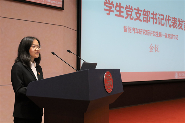 2021级博士研究生、智能汽车研究所研究生第一党支部书记金悦作为学生党支部书记代表分享成长感悟。她回首自己以理论指导实践的支部工作、以全心全意服务奉献的实际行动、即使自身角色转变依然不曾改变的初心使命,结合自己作为党支部书记的经历,强调“古之立大事者,不惟有超世之才,亦必有坚忍不拔之志”,希望同学们在交大的求学之路上不畏艰险、百炼成钢,勉励新生党员为学校增添荣誉,为行业添砖加瓦,为国家贡献力量。
