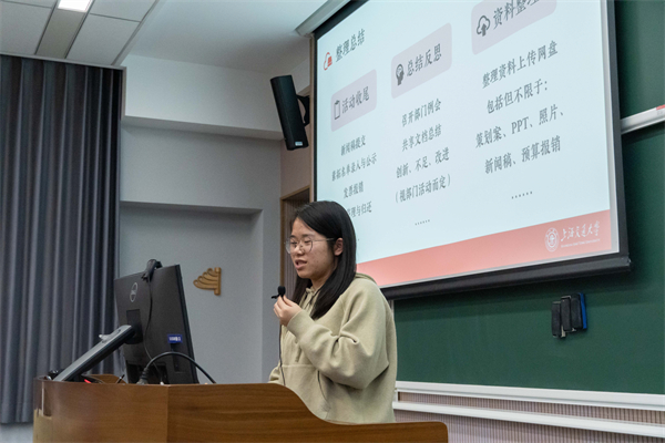 在活动准备部分中,主席团成员李杨从活动策划、预算报销、场地借用、物资租借四个方面为大家介绍了活动准备的相关事宜,并重点梳理了整个流程的时间线索;紧接着,主席团成员关茗泽对素拓认证、第二课堂以及一些相关网站进行了介绍,其中详细说明了第二课堂和相关网站的使用流程,并对其中的要点进行了梳理总结。