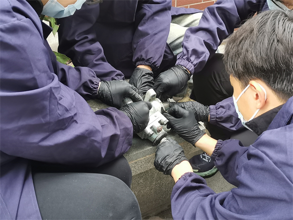 表面准备过程中,同学们交替使用粗砂纸和细砂纸耐心地处理旧漆面,直至其露出金属光泽,并用刷子刷去表面灰尘,而后使用泡沫清洁剂对设备表面进行了简单清理。